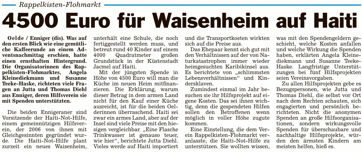 Frau Diehl, Vorsitzende des Vereins „Haiti-Not-Hilfe” war am Mittwoch 3. Februar in unserer Schule zu Gast. Frau Vöge überreichte ihr den symbolischen Scheck über 1466,77 € - Geld, das die Kinder der Augustin-Wibbelt-Schule zusammengetragen hatten, um den Verein bei der dringend notwendigen Hilfe für die Opfer der Erdbebenkatastrophe zu unterstützen. Frau Diehl bedankte sich herzlich bei den Jungen und Mädchen und ließ es sich nicht nehmen, einige Worte zu Haiti im Allgemeinen und zur Situation der Kinder zu sagen, die von der Haiti-Not-Hilfe unterstützt werden. Außerdem erklärte Frau Diehl, was mit den Wadersloher Spendengeldern geschehen wird.